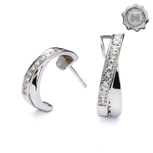 MILLENNE Made For The Night Cris-Crossed Half Cubic Zirconia White Gold Hoop Earrings with 925 Sterling Silver