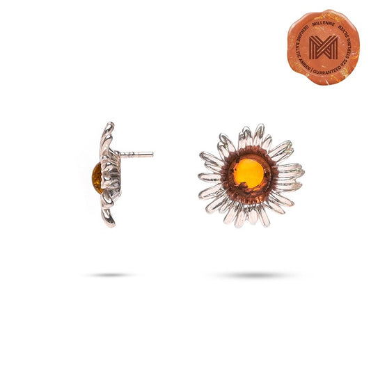 MILLENNE Multifaceted Baltic Amber Daisy Silver Stud Earrings with 925 Sterling Silver