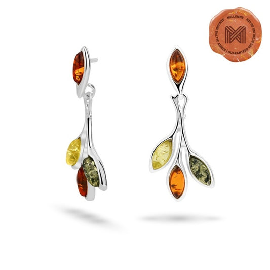 MILLENNE Multifaceted Baltic Amber Branching Leaves Silver Drop Earrings with 925 Sterling Silver