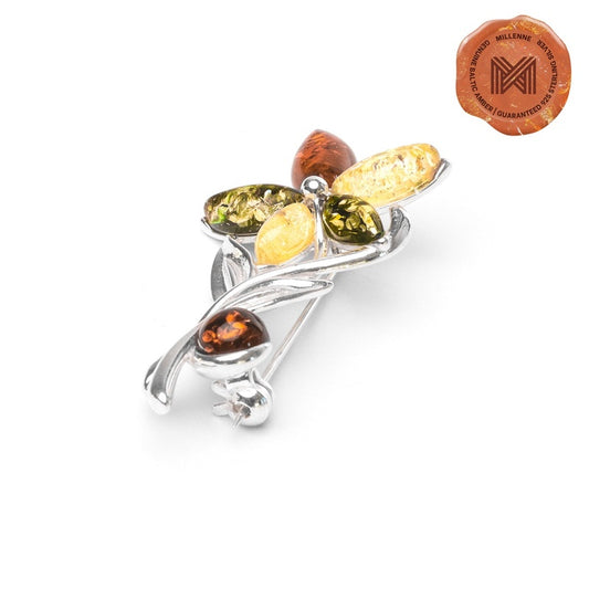 MILLENNE Multifaceted Baltic Amber Fresh Flower Silver Brooch with 925 Sterling Silver
