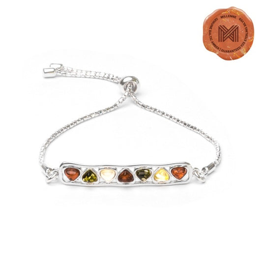 MILLENNE Multifaceted Baltic Amber Multicolors Bar Drawstring Silver Bracelet with 925 Sterling Silver
