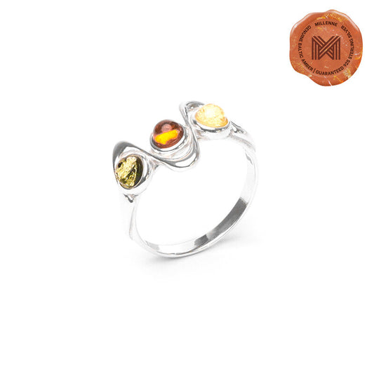 MILLENNE Multifaceted Baltic Amber Triad Silver Adjustable Ring with 925 Sterling Silver