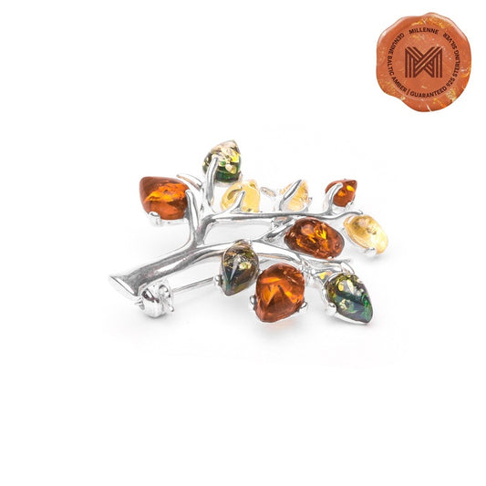 MILLENNE Multifaceted Baltic Amber Colours of Fall Silver Brooch with 925 Sterling Silver