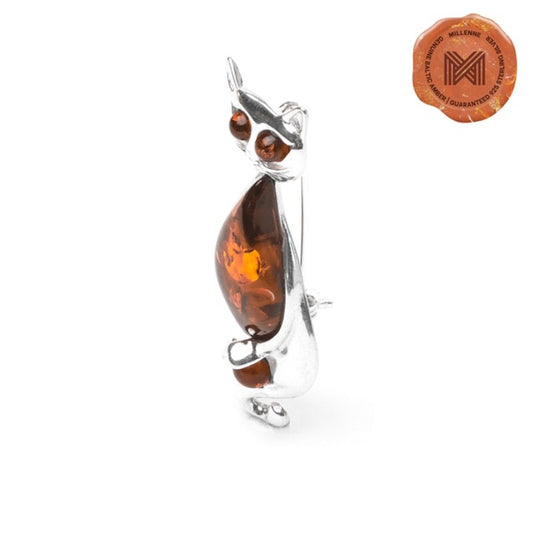 MILLENNE Multifaceted Baltic Amber Cat Silver Brooch with 925 Sterling Silver