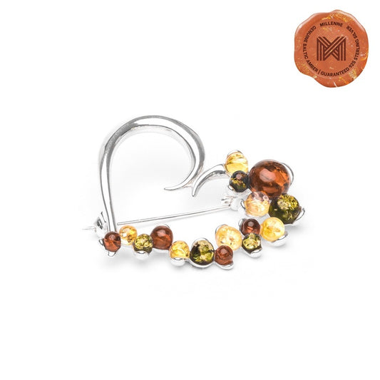 MILLENNE Multifaceted Baltic Amber Assymmetric Heart Silver Brooch with 925 Sterling Silver