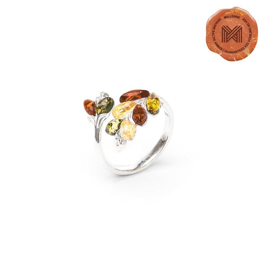 MILLENNE Multifaceted Baltic Amber Graduated Leaf Silver Adjustable Ring with 925 Sterling Silver