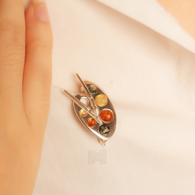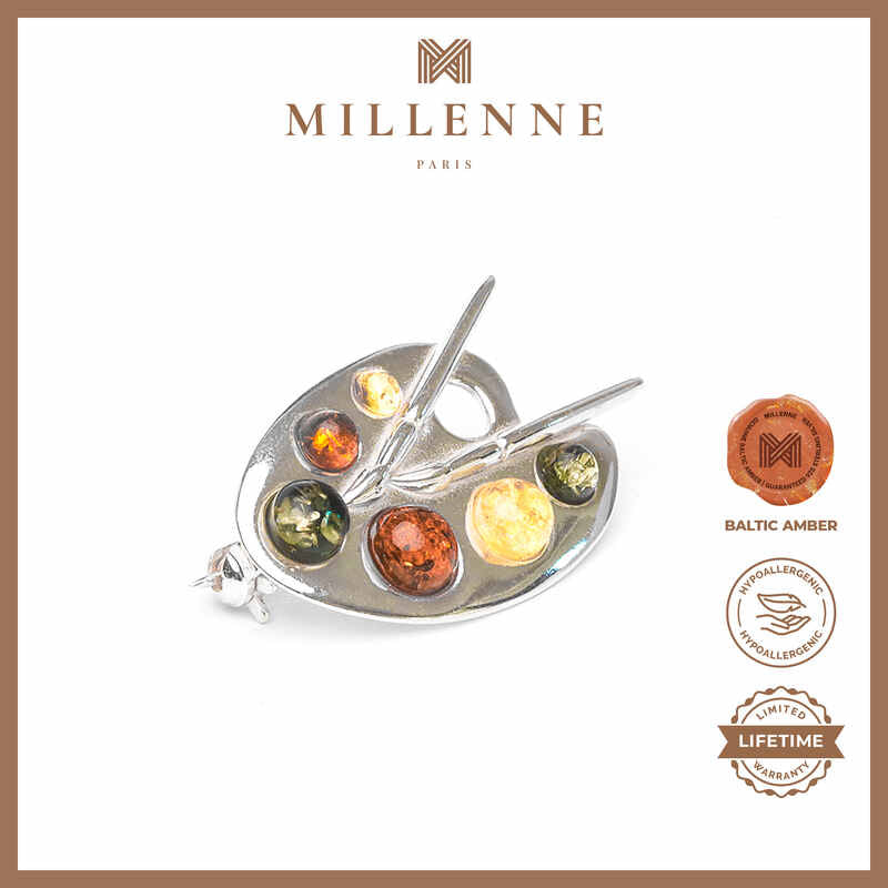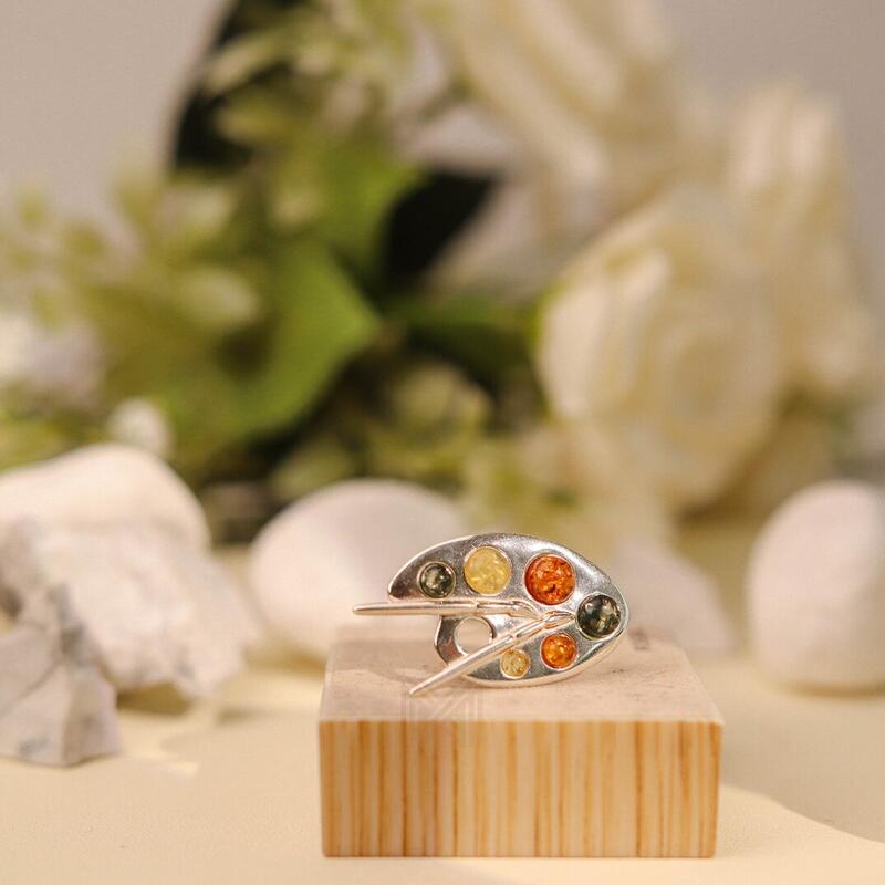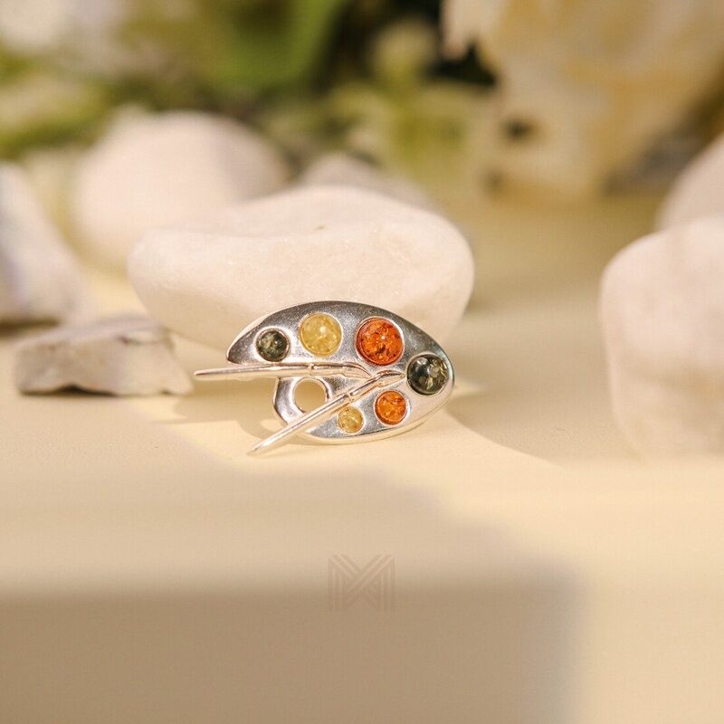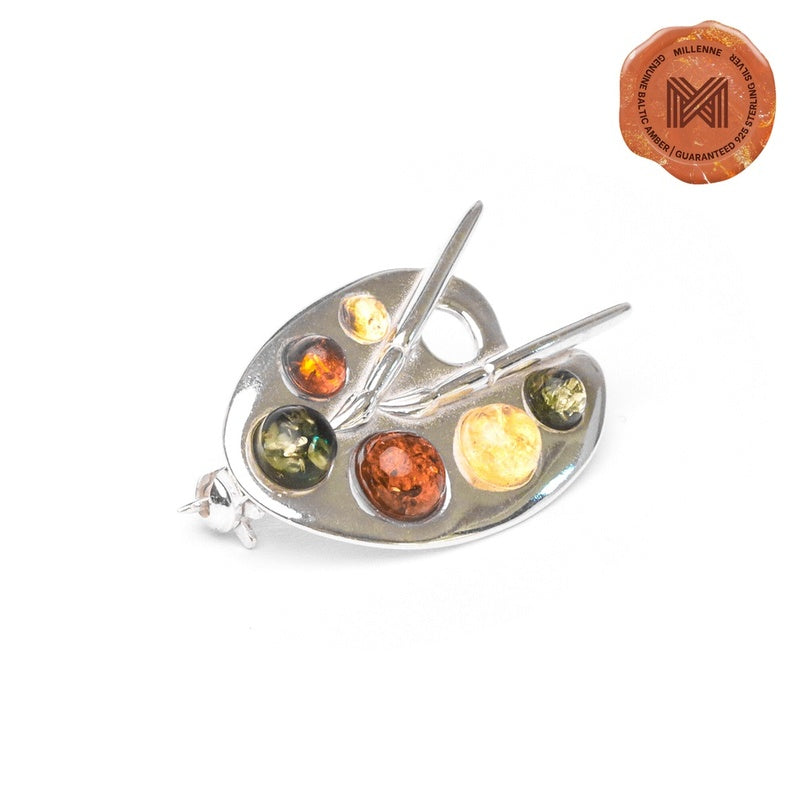 MILLENNE Multifaceted Baltic Amber Artist Pallette Silver Brooch with 925 Sterling Silver